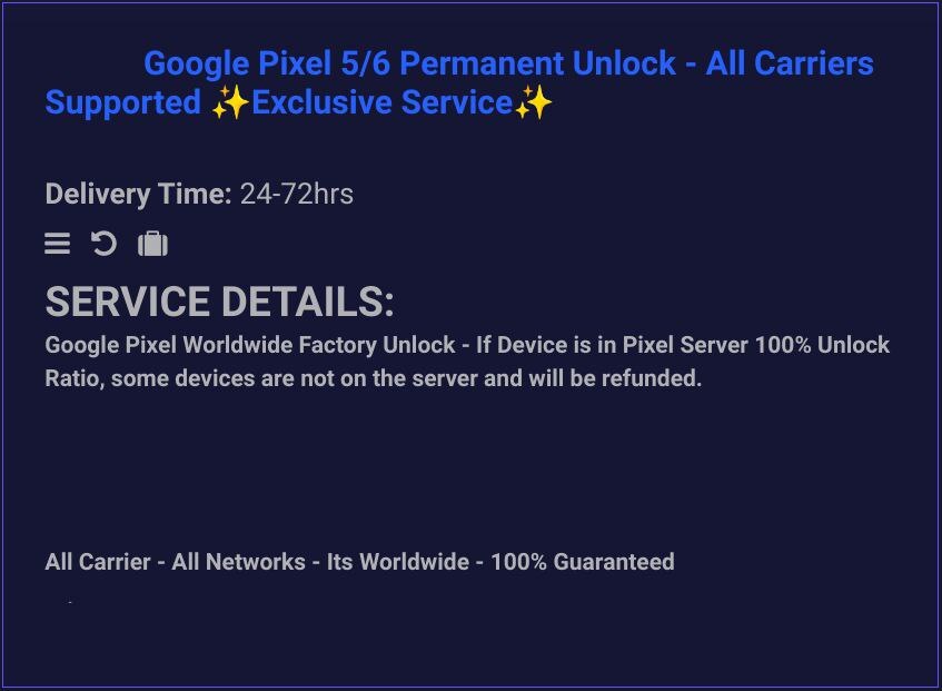 This service provides a direct source factory unlock for Google Pixel 5 - 6 - 7 - 5a - 6a Series models from any carrier worldwide. Skip waiting 60-90 days using the device on their network or waiting 24-36 months until your device is paid off before you are granted access to unlock your device like the carrier demands. Use our service & get your device unlocked today! No More Waiting!